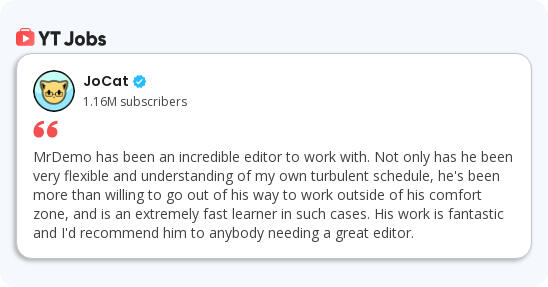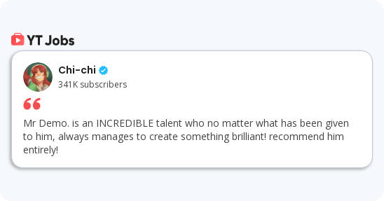 My name is Demo, I am a UK-based Creative who specializes in Screenplay Writing, Visual Editing, Voice Acting and even Directing. For the past two years I have worked online as a Freelance Creative, offering my services to many talented individuals and honing my skills. I am proficient with the Adobe Creative Suite, primarily in Adobe After Effects & Premiere Pro